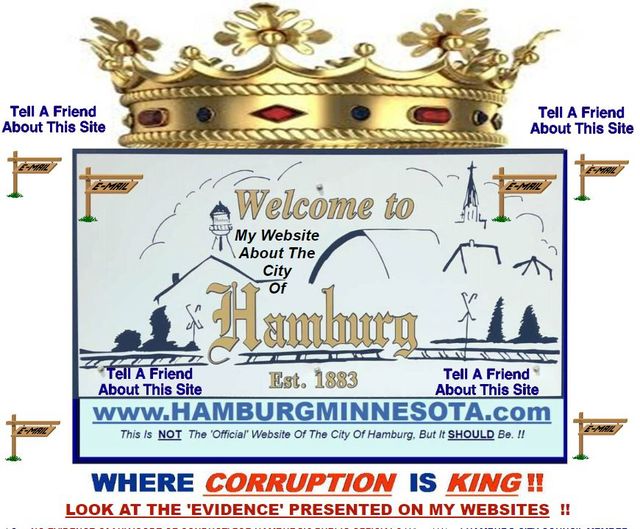 That’s a whole different story, but the ’end result’ was that the HAMBURG CITY COUNCIL wasted $50,000.00 TAXPAYER DOLLARS in their (unsuccessful) attempt to force me to resign my position on the City Council !! While the HAMBURG CITY CLERK/TREASURER was the ‘catalyst’ behind the effort to remove me, the ’contract’ HAMBURG CITY ATTORNEY, KELLY DOHM, from the Waconia based law firm of MELCHERT, HUBERT & JODIN was ‘right in there pitchin’ along side the other member of the HAMBURG CITY COUNCIL, coming of with all these wild and grandiose 'ideas’ of ‘tactics to try’ that were taking money out of the Taxpayers (Hamburg’s) ’bank account’ and ‘fattening up’ the law firms bank account!!