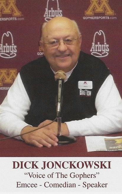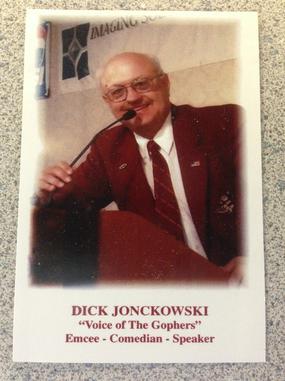 He started his broadcasting career as a disc jockey in Ladysmith, Wisconsin. In 1966, he became sports director at KSMM-AM in Shakopee. He's also carved out a career as an announcer, emcee and guest speaker at events ranging from state tournament games to charity banquets. "A lot of the teams I've worked for are now defunct," he said. "Someone once said, 'If you want your team to leave town, hire Dick Jonckowski.'"